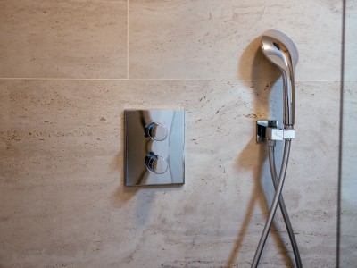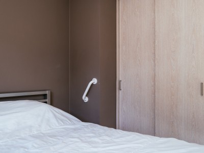 L'appartement est aménagé pour les personnes à mobilité réduite, avec notamment des toilettes suspendues surélevées avec des poignées, une douche à l'italienne avec sol antidérapant au lieu d'une baignoire, et une chambre avec un lit surélevé à hauteur de siège avec une poignée.