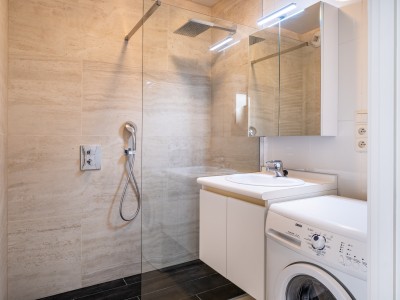 L'appartement se compose d'un hall, salle de bains avec douche italienne et lave-linge, toilette séparée, une chambre avec un lit double et une chambre avec deux lits simple, living moderne et spacieux avec cuisine ouverte et entièrement équipée, débarras, belle terrasse en bankirau ensoleillée avec table de jardin.