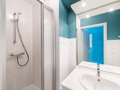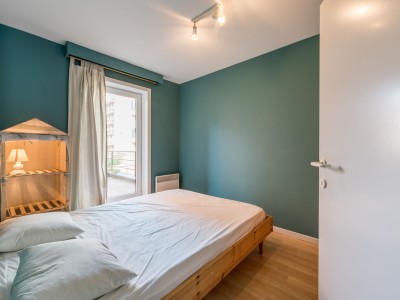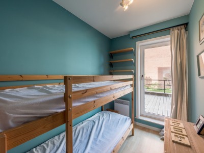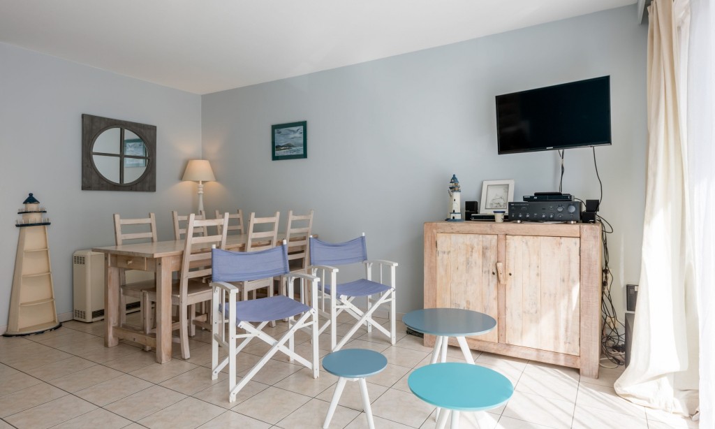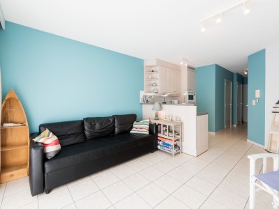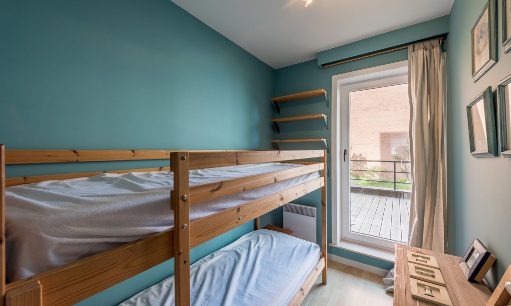 Hall, living moderne avec cuisine ouverte et équipée, wc, salle de douches, une chambre avec lit superposé, une chambre avec un lit double.