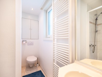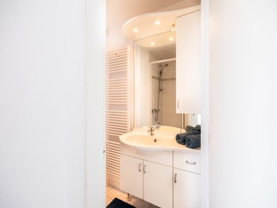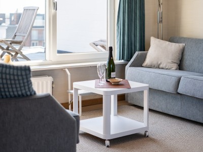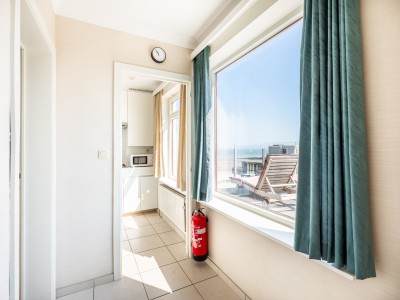 Hall, living avec double divan-lit, cuisine séparée, salle de bains avec douche et WC,une chambre avec lit double. Terrasse avec vue sur mer sur le côté de la salle de séjour.