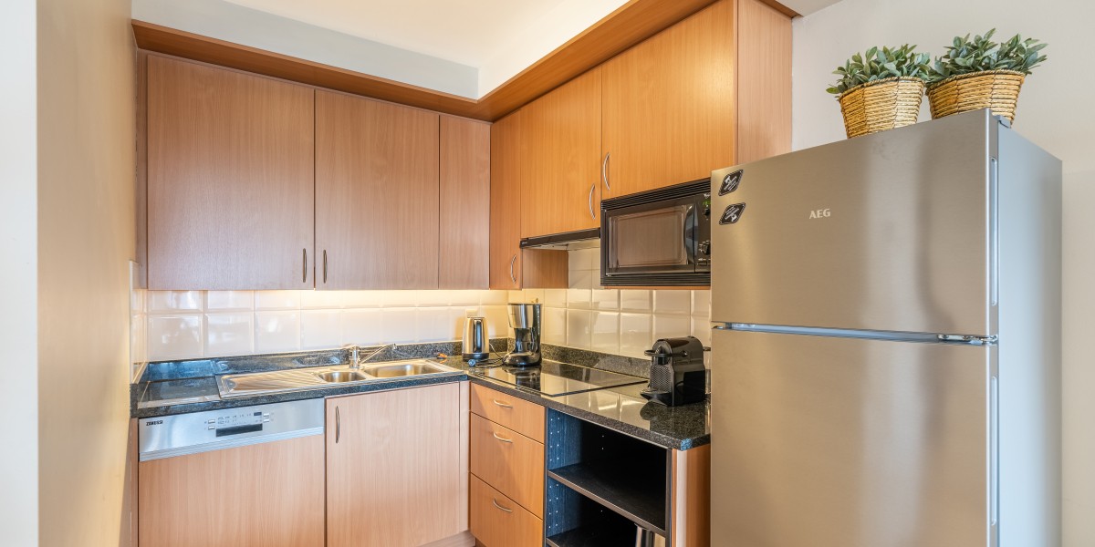 • Cuisine: cuisiné équipée avec appareils encastré, taque vitro céramique, four micro-ondes, hotte, lave-vaisselle, réfrigirateur avec petit congélateur, percolateur, bouilloire