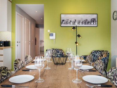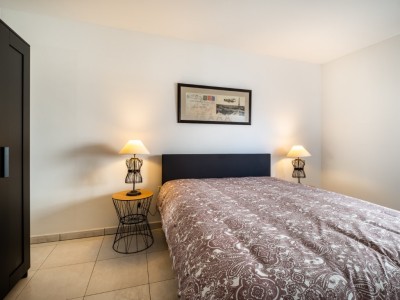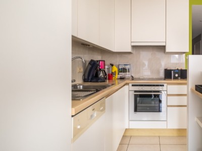 Séjour ensoleillé avec balcon et mobilier moderne, cuisine ouverte, 2 chambres à coucher, 1 chambre avec un lit double, 1 chambre avec des lits superposés (lit double en bas et 1 lit pers en haut) salle de bain avec baignoire et rideau de douche et machine à laver, toilettes séparées.