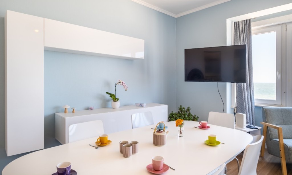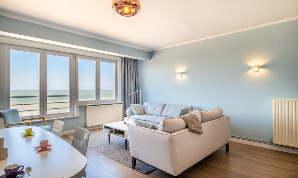 Hall d'entrée, grand salon/salle à manger avec vue sur la mer, cuisine ouverte équipée, salle de bain avec baignoire, toilettes séparées, 1 chambre à coucher avec lit double, 2 chambres à coucher avec 2 lits simples chacune.