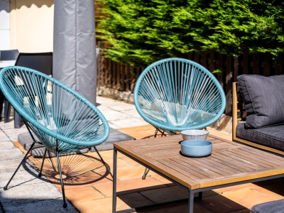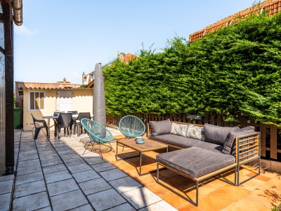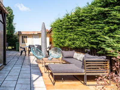 Allée avec espace pour 1 voiture, terrasse meublée sur le côté de la maison avec bbq, salon pour 6 personnes, table, 6 chaises et grand parasol.