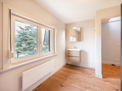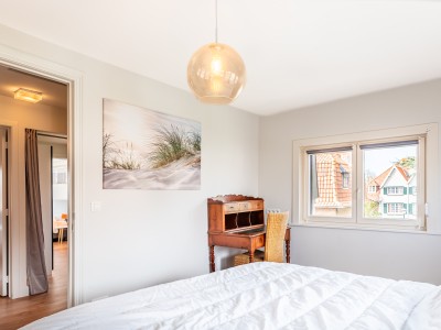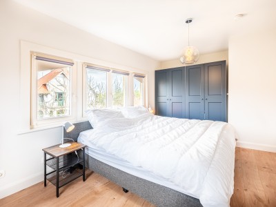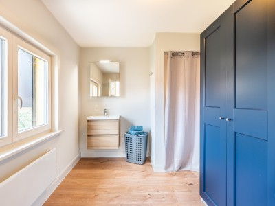 1 grande chambre avec un grand lit double, beaucoup d'espace de rangement et un bureau, 1 chambre avec un lit double et accès à un petit balcon, 1 chambre avec des lits superposés pour 3 personnes. Dans cette pièce se trouvent également un bureau et l'escalier du grenier. Il y a des toilettes et un coin avec un lavabo et un miroir dans le grand hall de nuit.