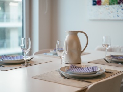 Appartement avec hall, débarras, living avec vue sur mer, cuisine entièrement équipée et ouverte, chambre avec lit double, chambre avec lit superposé, salle de bains avec baignoire, toilette séparée de la salle de bains.