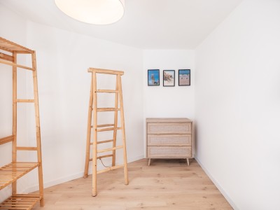 Cuisine ouverte équipée, salon/salle à manger, accès au petit jardin, 1 chambre avec lit double, 1 salle de bain avec douche à l'italienne, 1 toilette, débarras avec machine à laver.