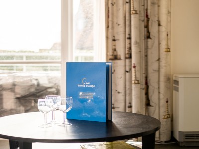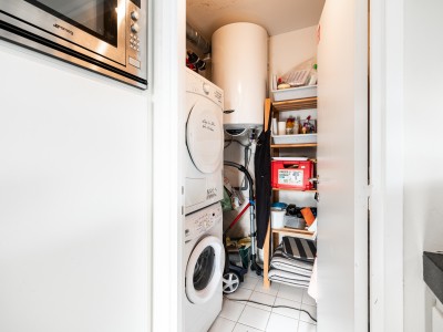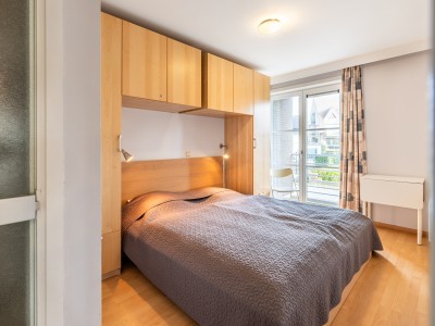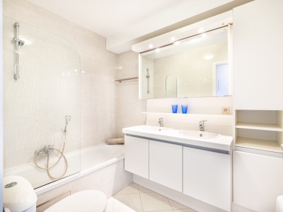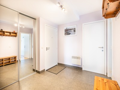 L'appartement comprend un hall d'entrée avec toilettes séparées, vestiaire, salon avec balcon/terrasse tout autour, cuisine ouverte et équipée avec plaque de cuisson vitrocéramique, lave-vaisselle, four à micro-ondes combiné, réfrigérateur avec congélateur. Un débarras avec machine à laver, sèche-linge, fer à repasser, planche à repasser, étendoir. Coin repas avec table et 8 chaises, 2 chaises + pouf (modèle Ikea Pello), canapé-lit pour 2 personnes dans le salon, 1 chambre avec 1 lit double et sa propre salle de bains attenante avec douche, 2e chambre avec lits superposés et un sommier extensible + matelas pour une personne, 3e chambre avec 2 lits simples côte à côte, 2e salle de bains avec baignoire, toilettes et lavabo.