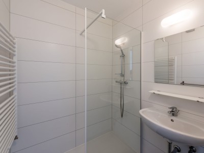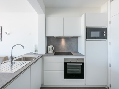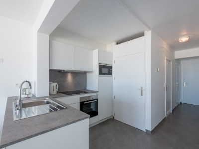 Hall, salon avec belle vue sur la mer, cuisine ouverte entièrement équipée, toilettes, salle de bains avec douche italienne, chambre avec lit double et lavabo, chambre avec 2 lits superposés.