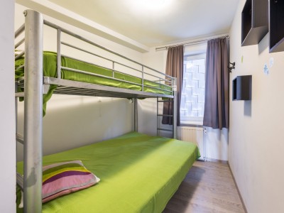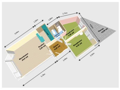 Hall d'entrée, salon avec vue latéral sur mer, cuisine ouverte et équipée, salle de bains avec douche et WC, chambre avec lit double, chambre avec lits superposés pour 3 personnes. Terrasse clôturée du côté des chambres. Garage fermé à 250m de l'appartement inclus.