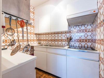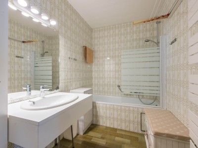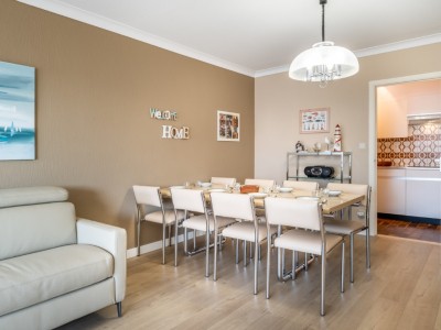 L'appartement se compose d'un hall, WC, salle de bain avec baignoire, une grande chambre avec lit double et lits superposés (2 x 1 personne), salon spacieux avec vue mer latérale et divanlit (2p), cuisine séparée, garage inclus dans le prix.