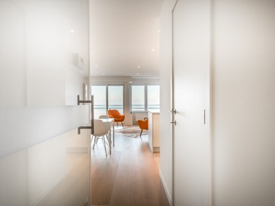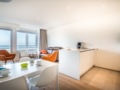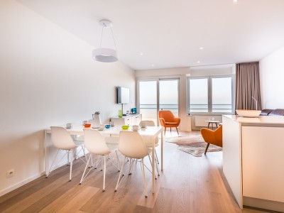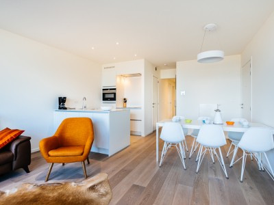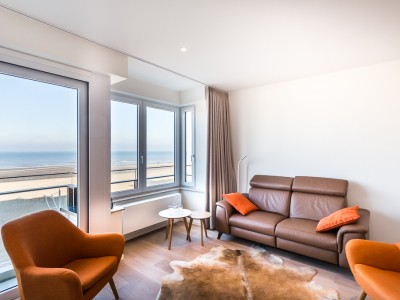 Appartement moderne et luxueux sur la digue, près des dunes, au 4ᵉ étage avec ascenseur. Séjour spacieux avec vue frontale sur la mer. Tout confort, style moderne. Animaux non admis.